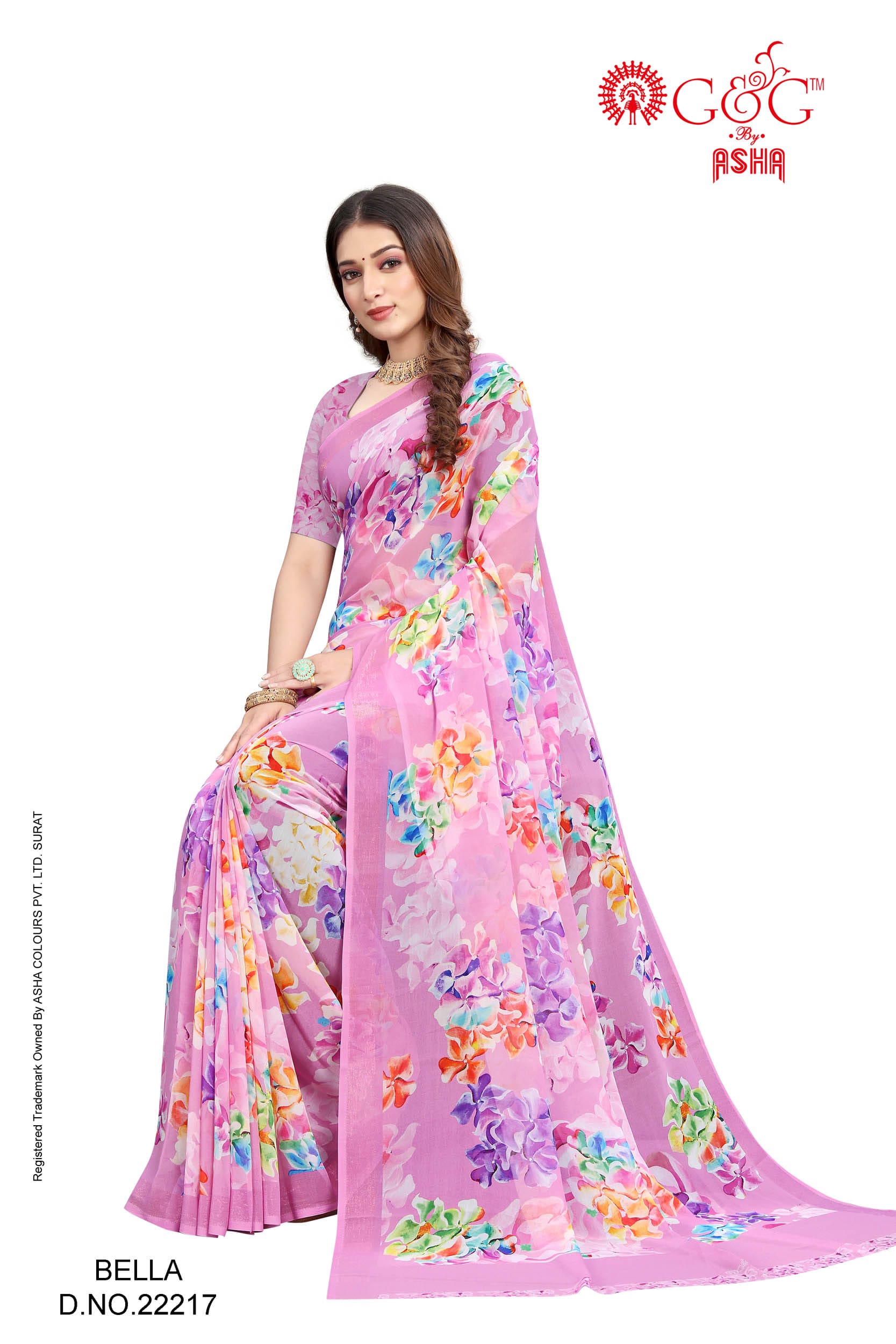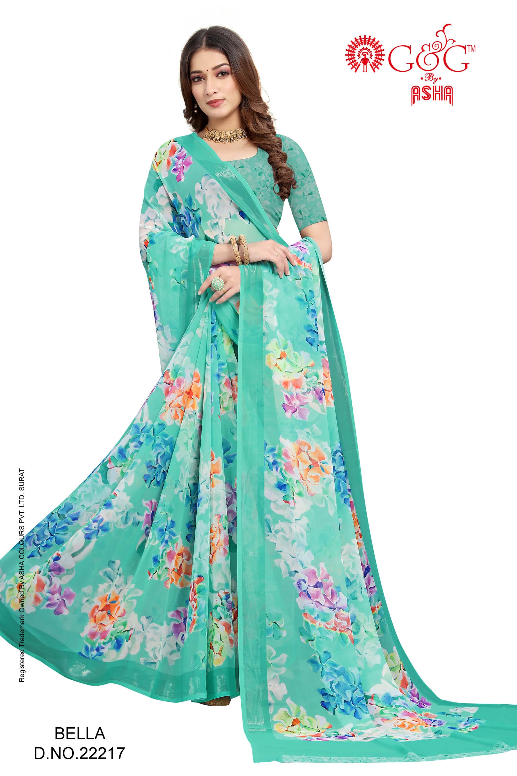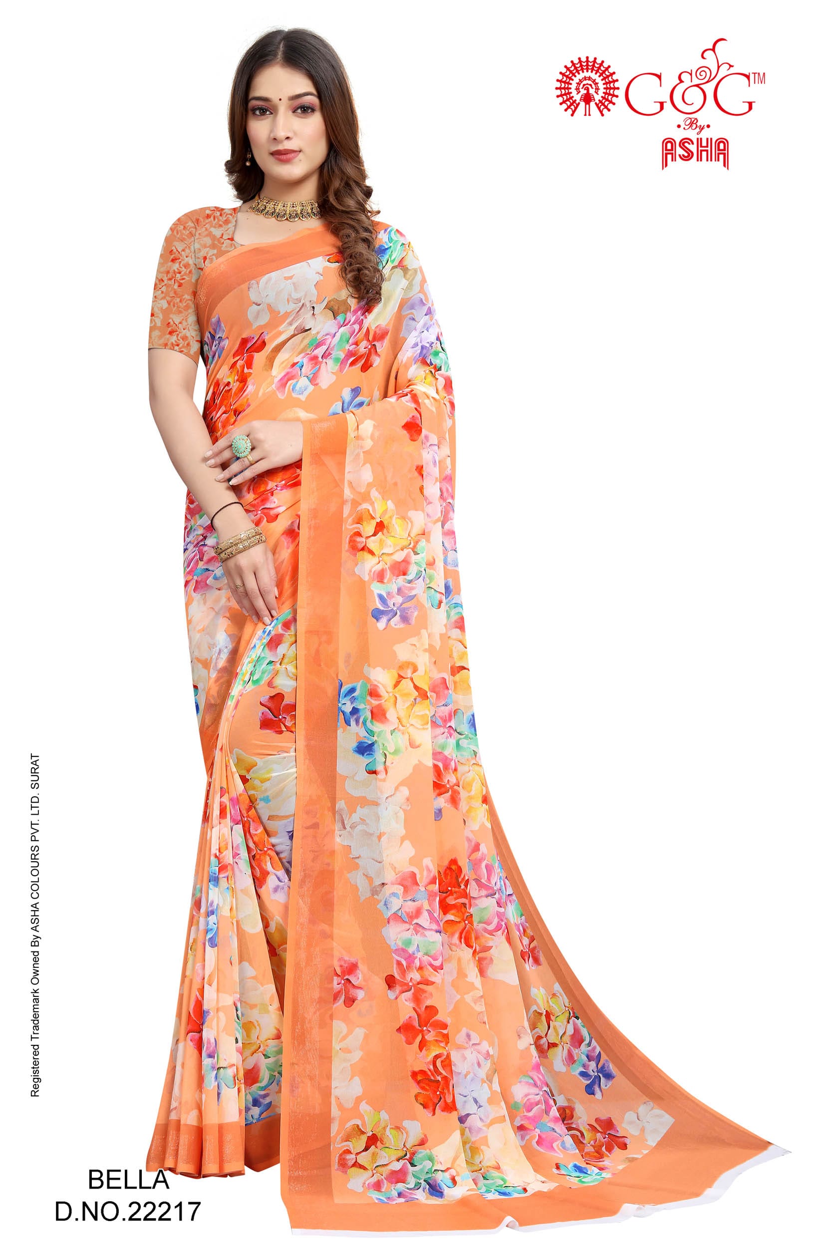 - Details: Digital printed saree on Soft-Geogette with zari border; Attached with 80 cms blouse-piece