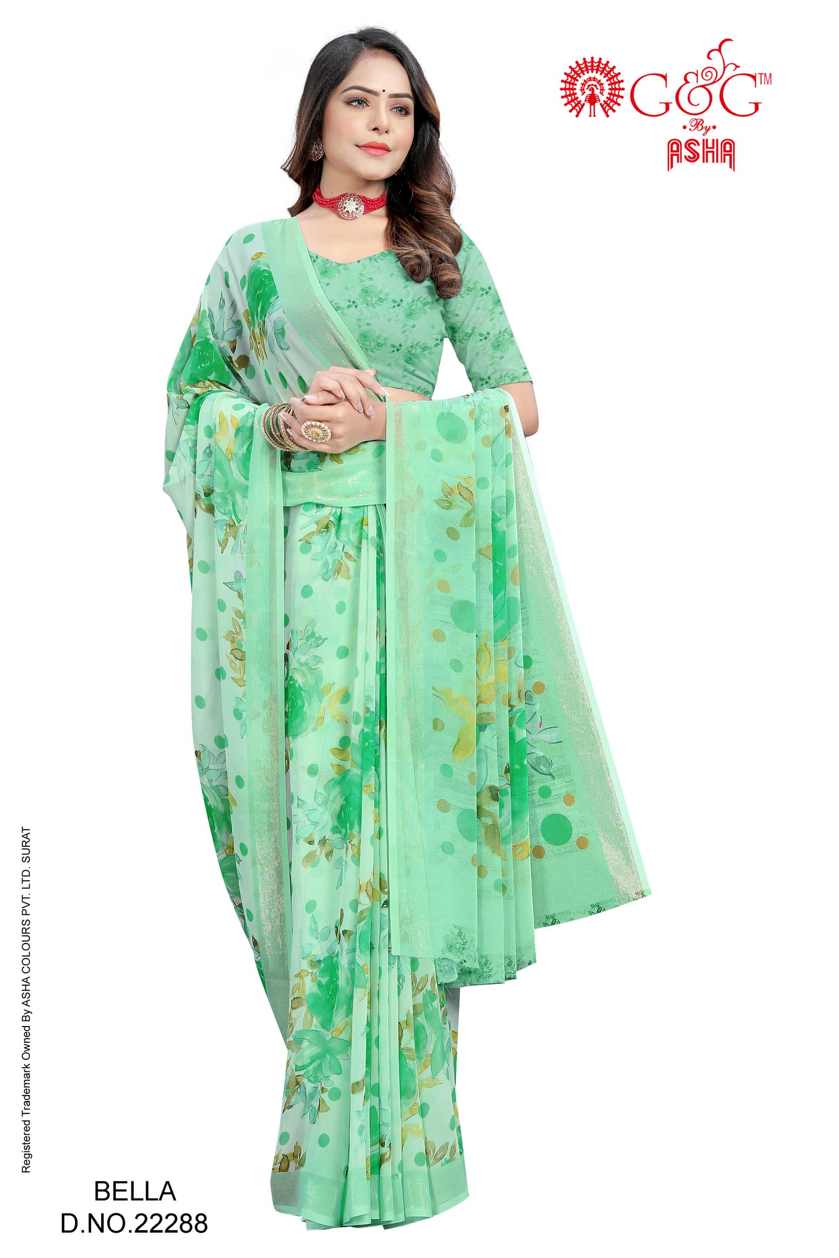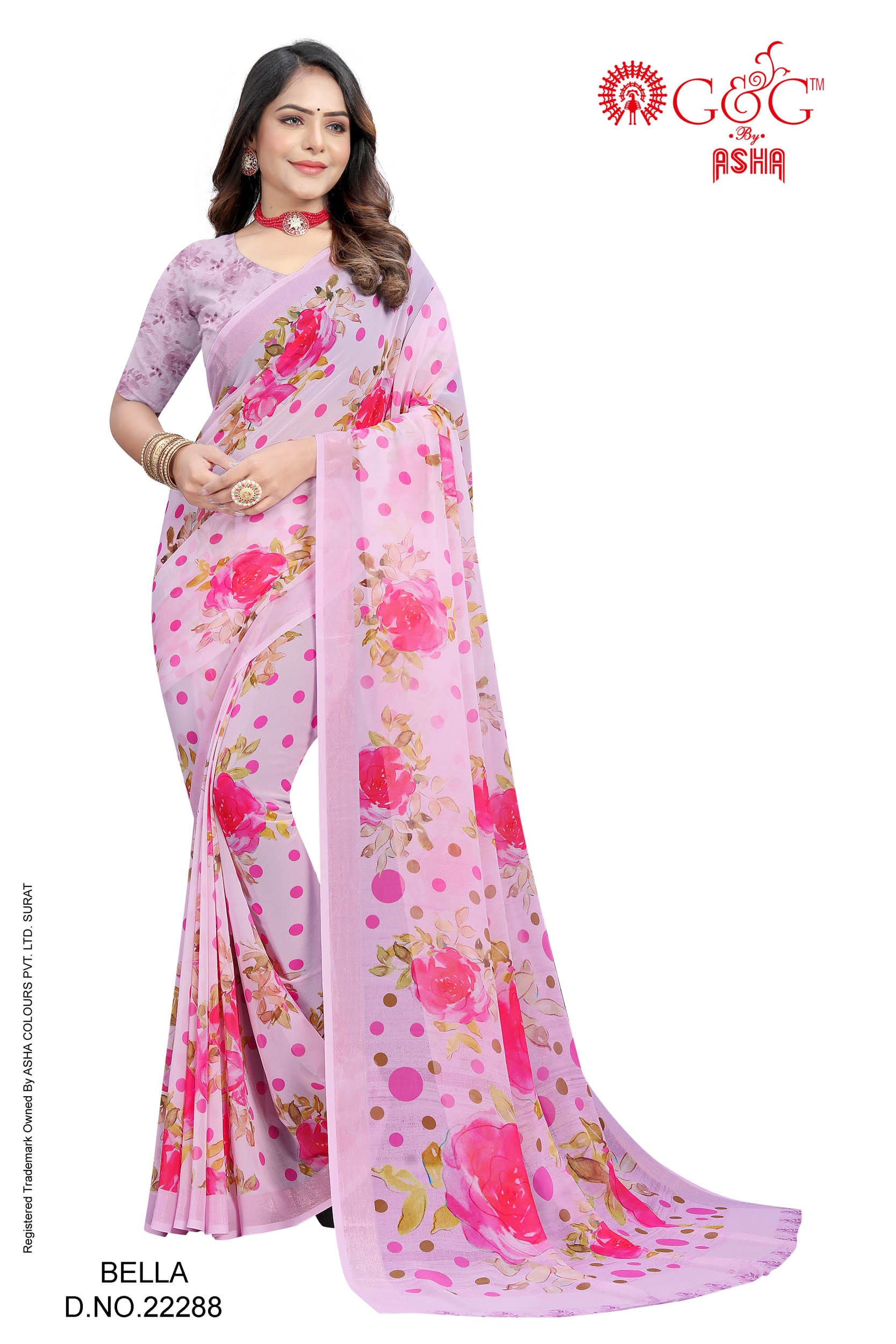 - Details: Digital printed saree on Soft-Geogette with zari border; Attached with 80 cms blouse-piece