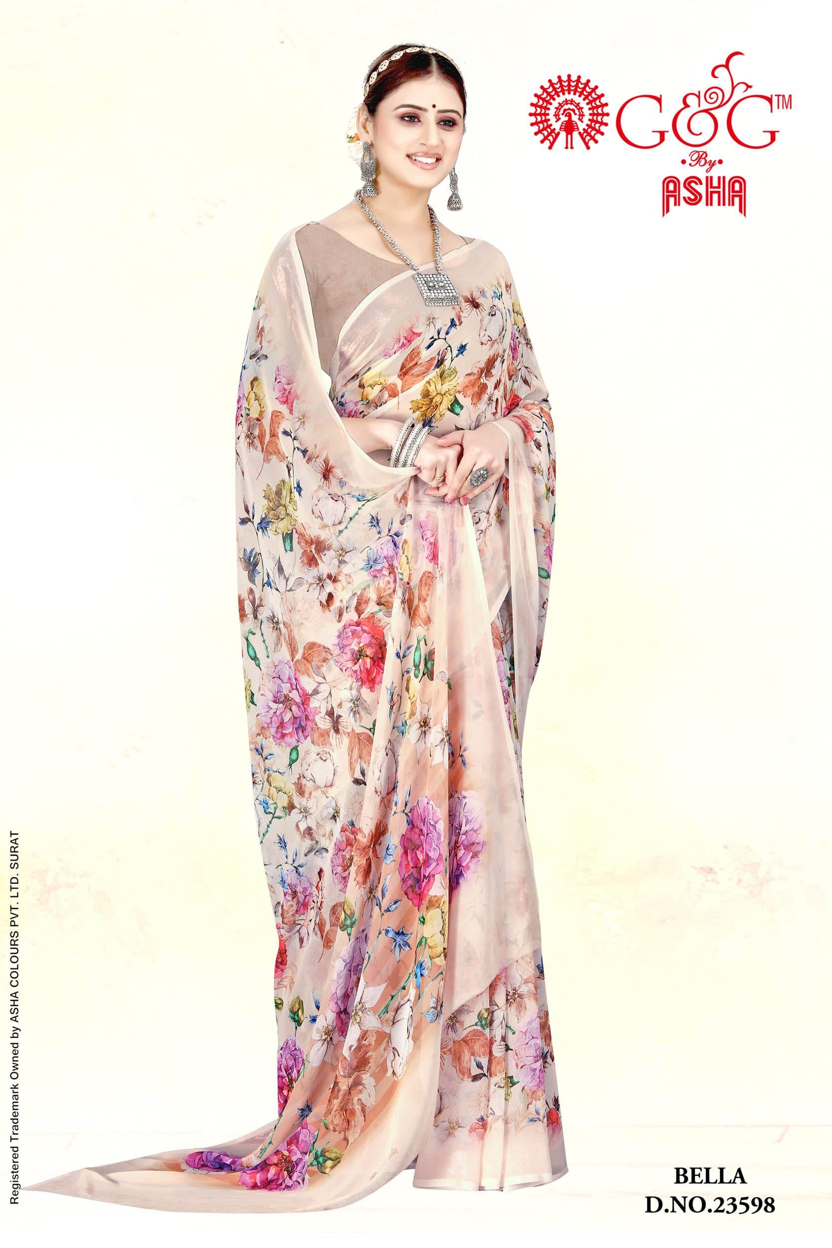 - Details: Digital printed saree on Soft-Geogette with zari border; Attached with 80 cms blouse-piece
