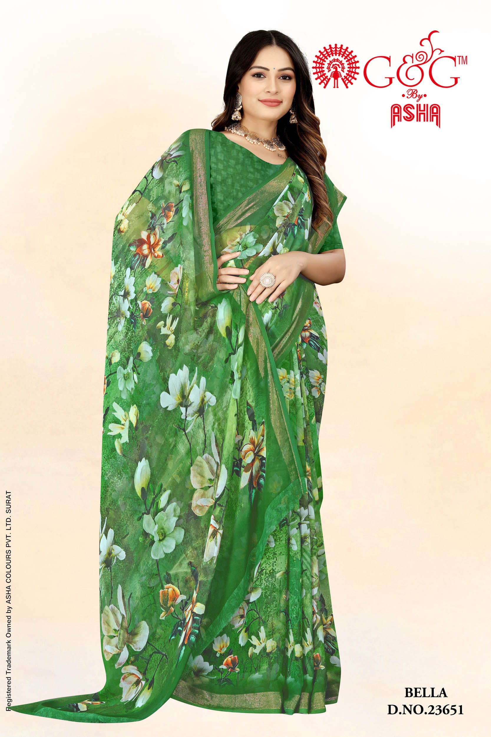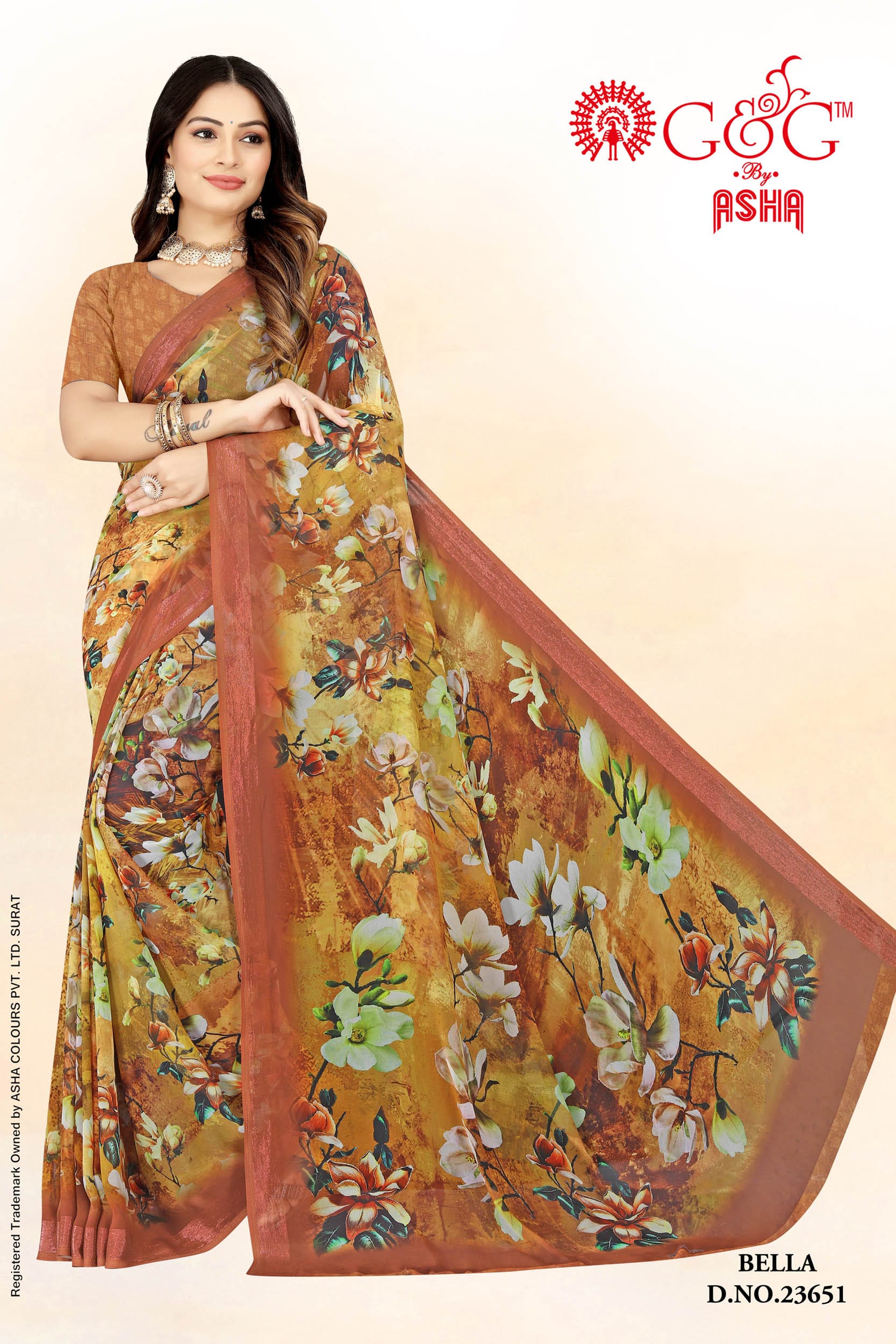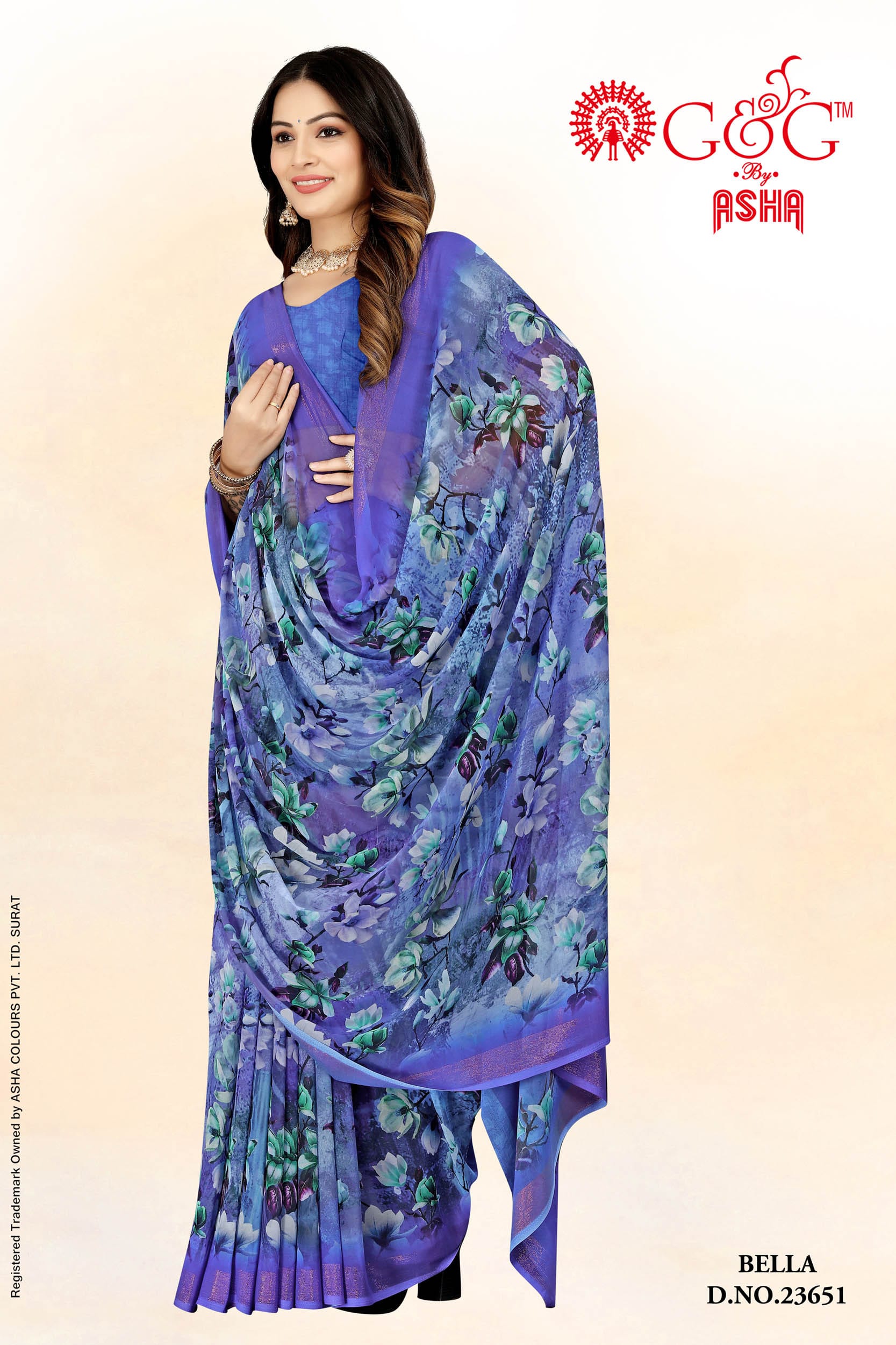 - Details: Digital printed saree on Soft-Geogette with zari border; Attached with 80 cms blouse-piece