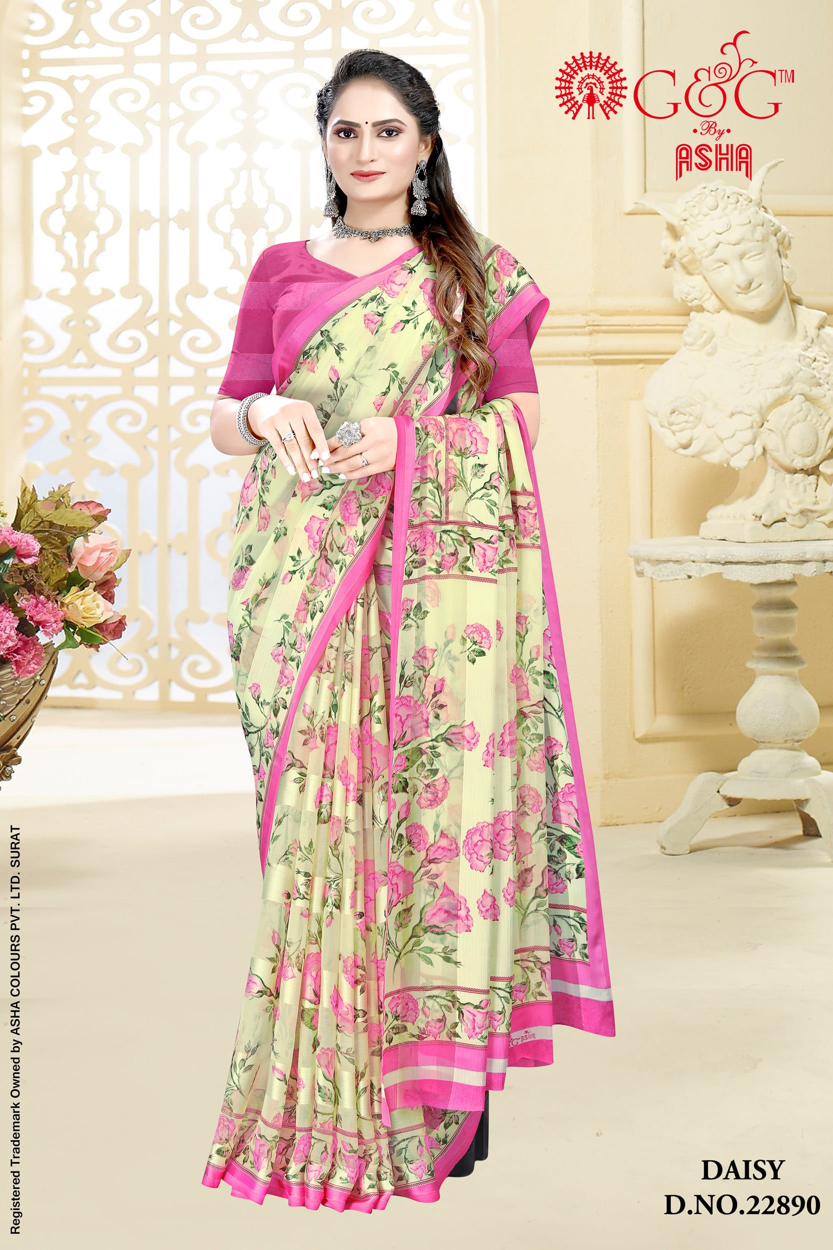 - Details: Chiffon Yurio as base fabric with satin stripes and zari lining; Attached with 80 cms blouse-piece