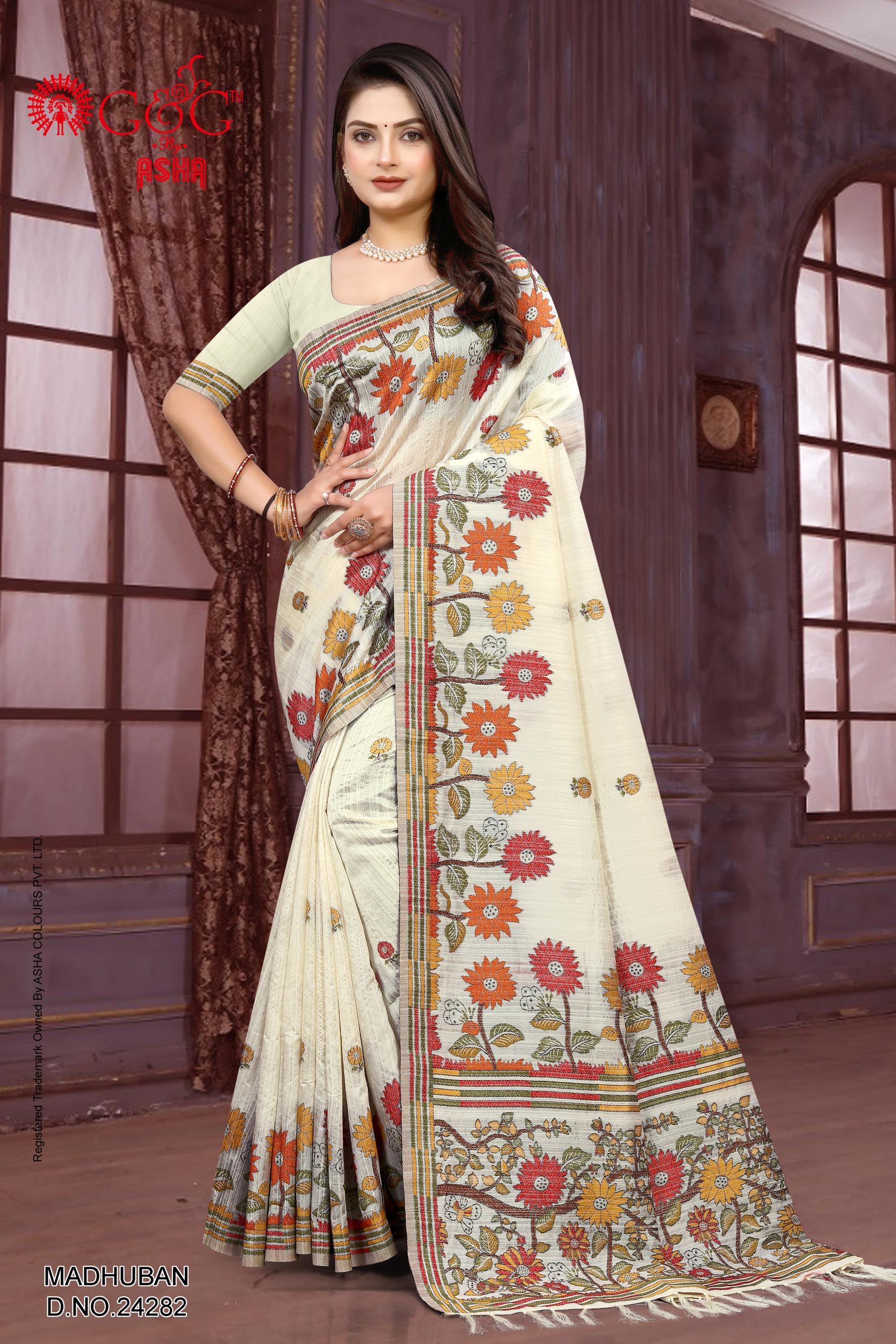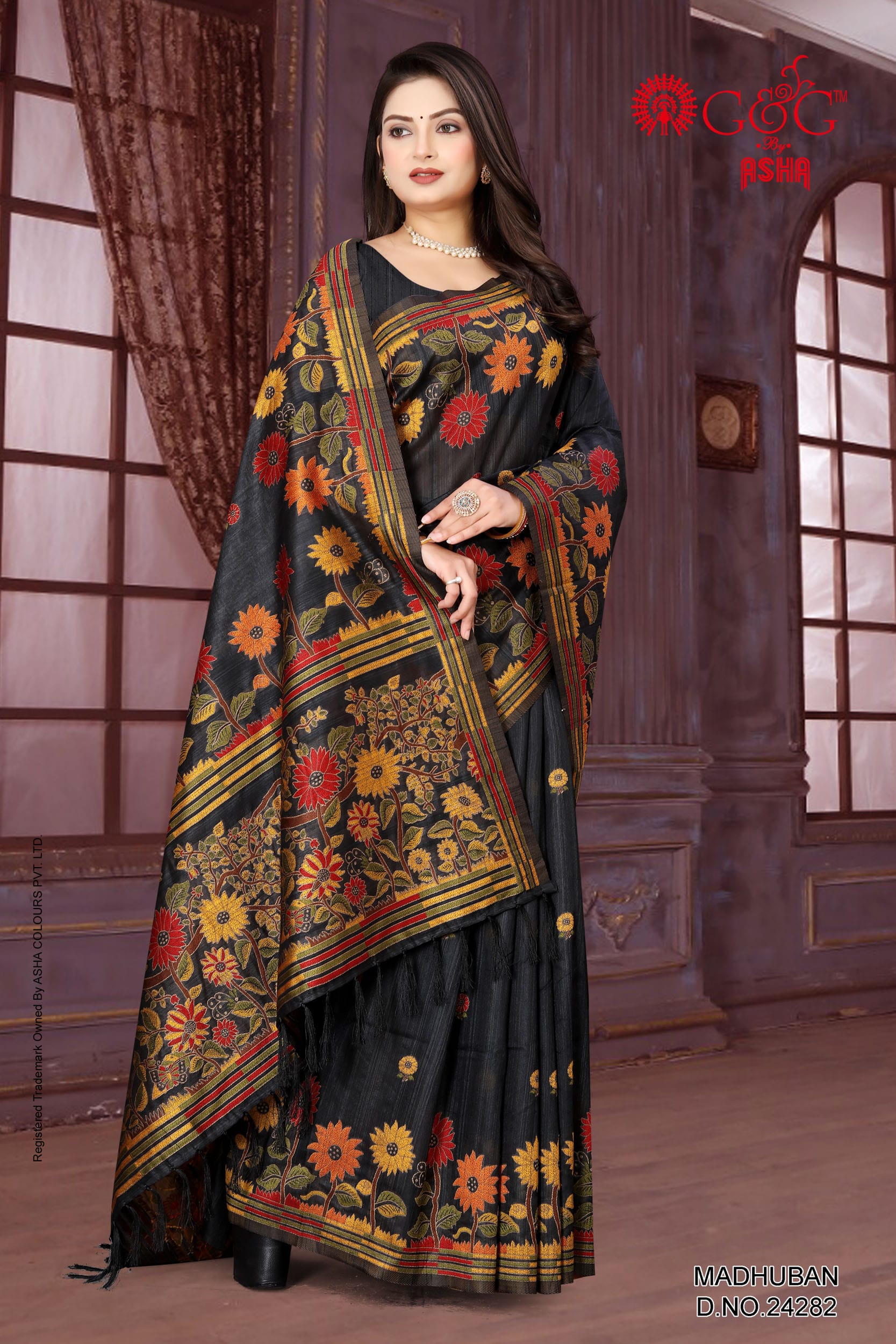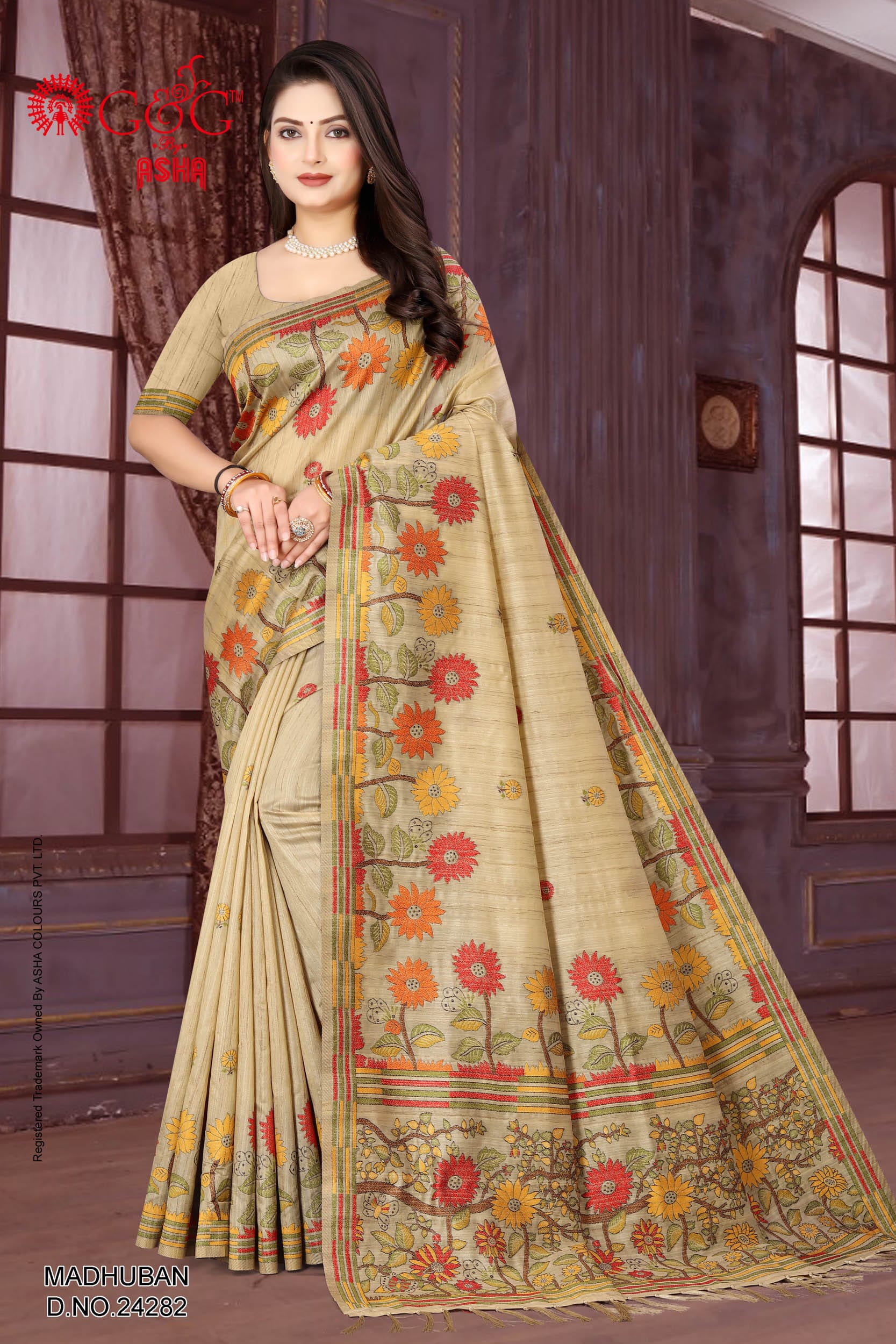 - Details: Madhuban - 24282 Discover the beauty of our Tusser Base Premium Woven Saree, crafted in Handloom Style with 100% polyester fabric. This saree comes with an attached 80 cm blouse-piece, offering a complete and stylish look for every event.